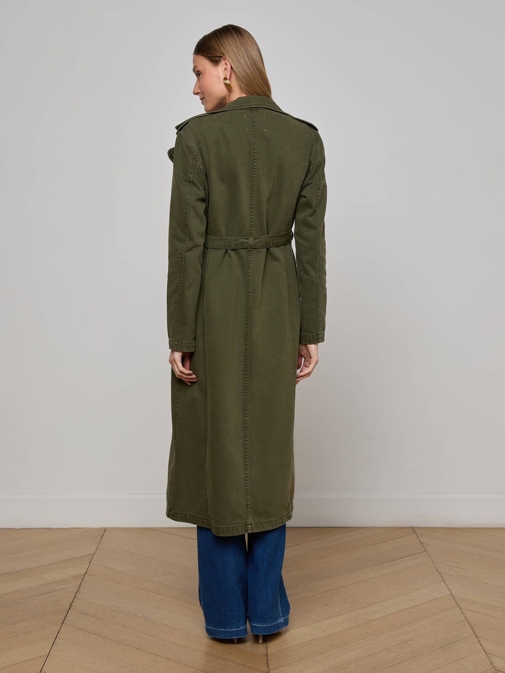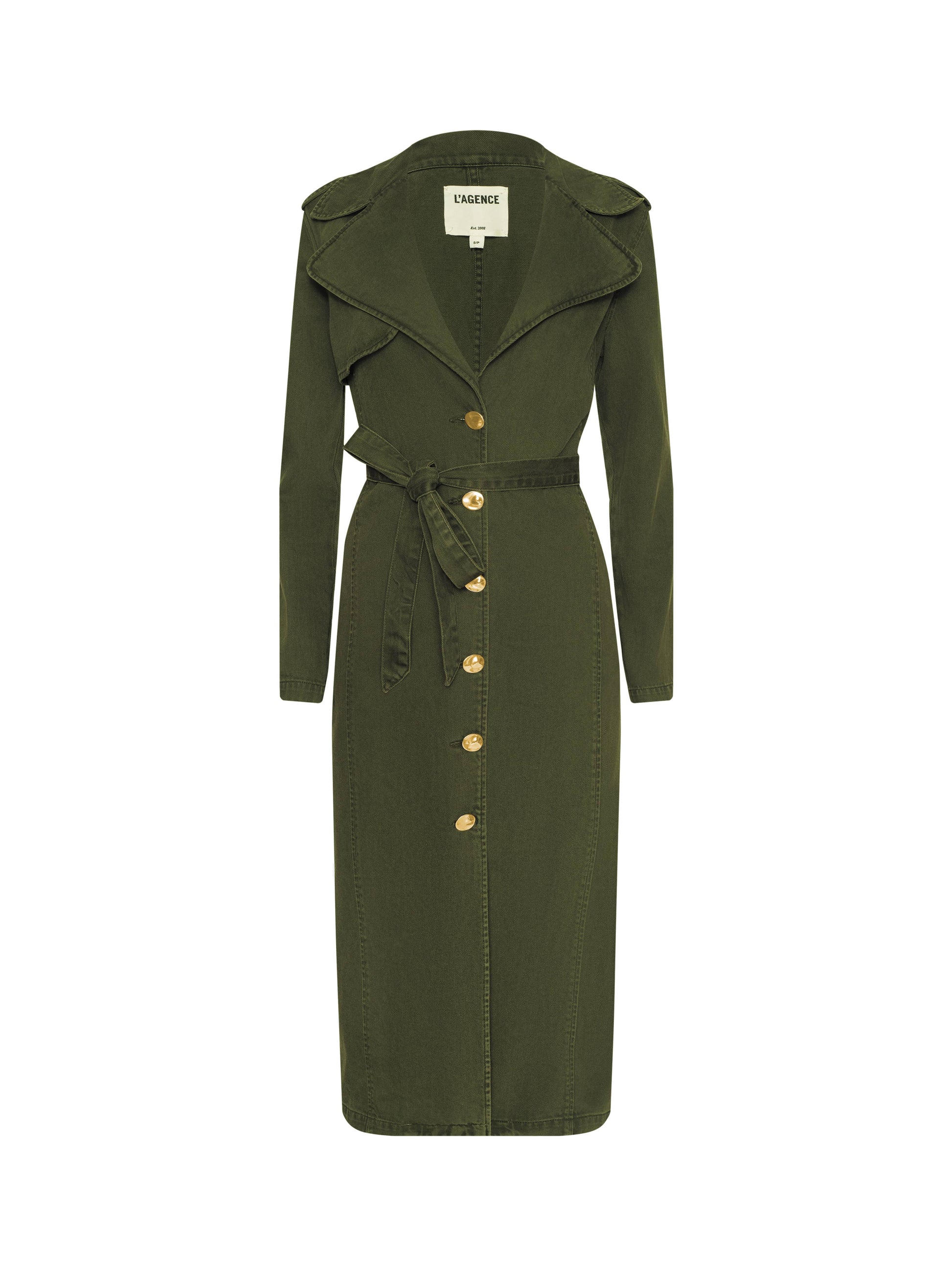 The must-have trench of the season. Introducing the Zavia, a refined denim trench constructed with an oversized collar and lapels, epaulets, and lightly padded shoulders for a strong silhouette, cinched together by a waist tie belt. Matte gold buttons elevate the clean silhouette with a luxe finish. Now in dark green.