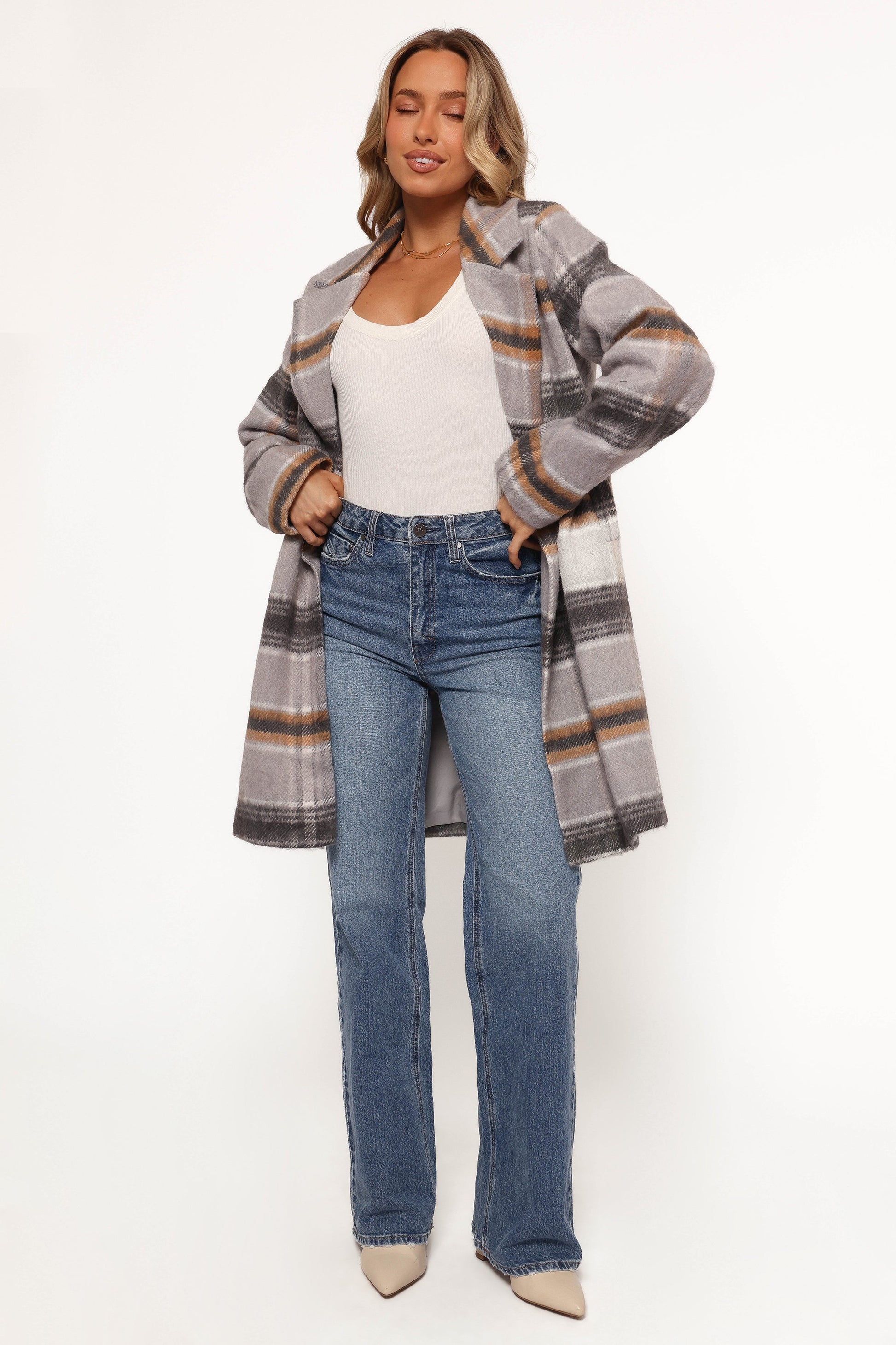 DETAILS Step into the spotlight with the Zella Long Coat in Grey Multi, a statement piece that transforms any outfit into a fashionable ensemble. Featuring a classic collared lapel and long sleeves, this double-breasted design showcases sophistication with a trendy twist.