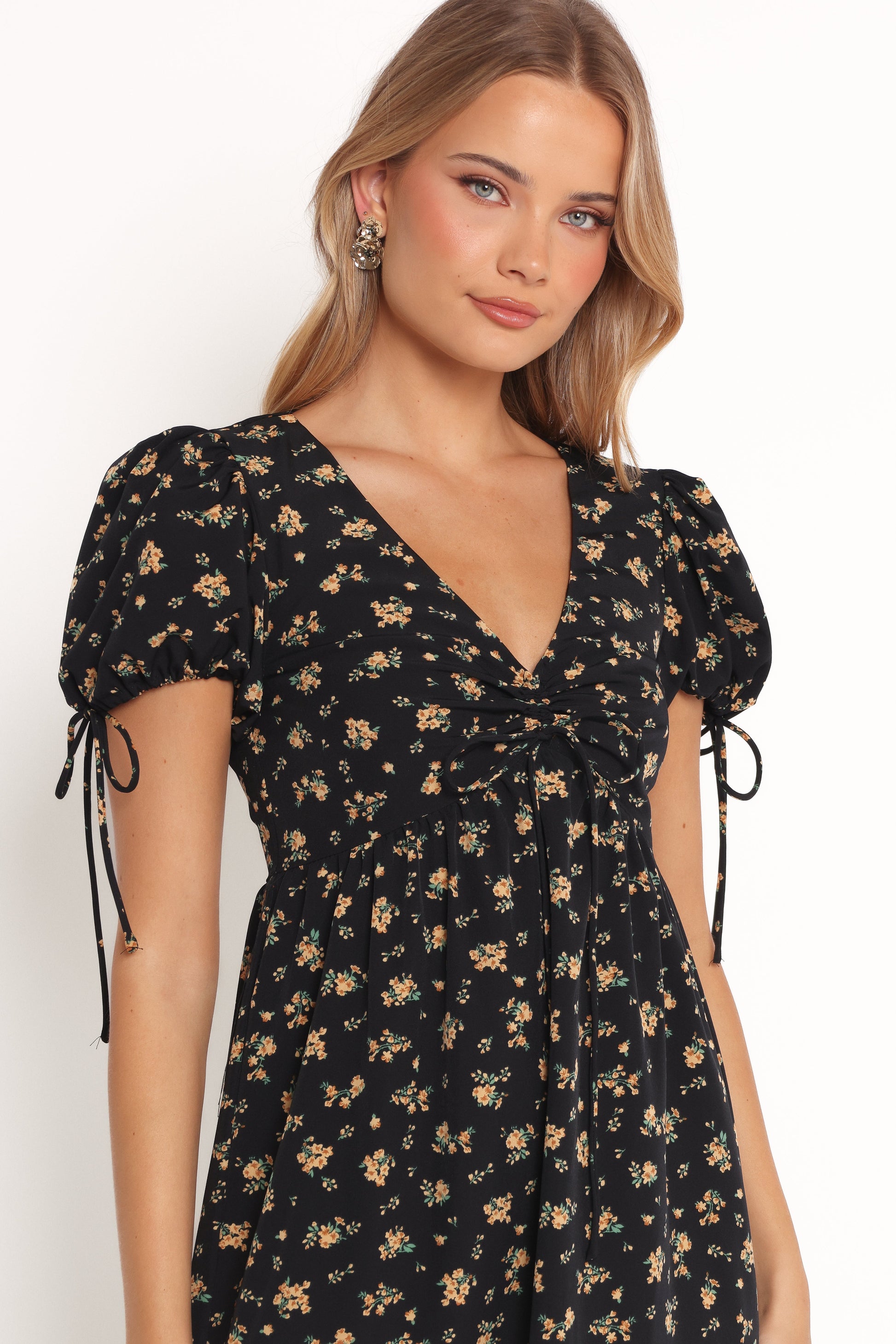 DETAILS Elevate your wardrobe with the Zina Maxi Dress in Black Floral, a timeless piece that effortlessly merges comfort with style. This maxi-length dress features a flattering V neckline and charming short puff sleeves with drawstring closures, adding a touch of elegance to your look.